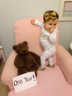 You're ONE! What a fun year it has been! It sure did go by fast. You are such a sweet and fun baby. You love your sisters and watching everything they do. You just light up whenever they are around. You are also a daddy's girl and really love to be with Daddy. You even will reach for him while I'm holding you! You sleep great at night, still nurse one time a day, eat all kinds of foods (favorites are chicken, sweet potatoes, avocado, banana, oatmeal) and you're very close to walking. You're a very busy girl now and rarely sit still, reminds me a lot of your oldest sister at this age:) You love baby dolls, dogs, watching Praise Baby and your paci and lovie. I love to rock you a night and have a hard time leaving you to sleep. I sometimes sneak in after you're asleep to pick you up and rock you longer:) I just love being your mommy and watching you grow! Looking forward to all the ways you'll grow this next year, whether I'm ready or not! Love you to the moon and back baby girl!